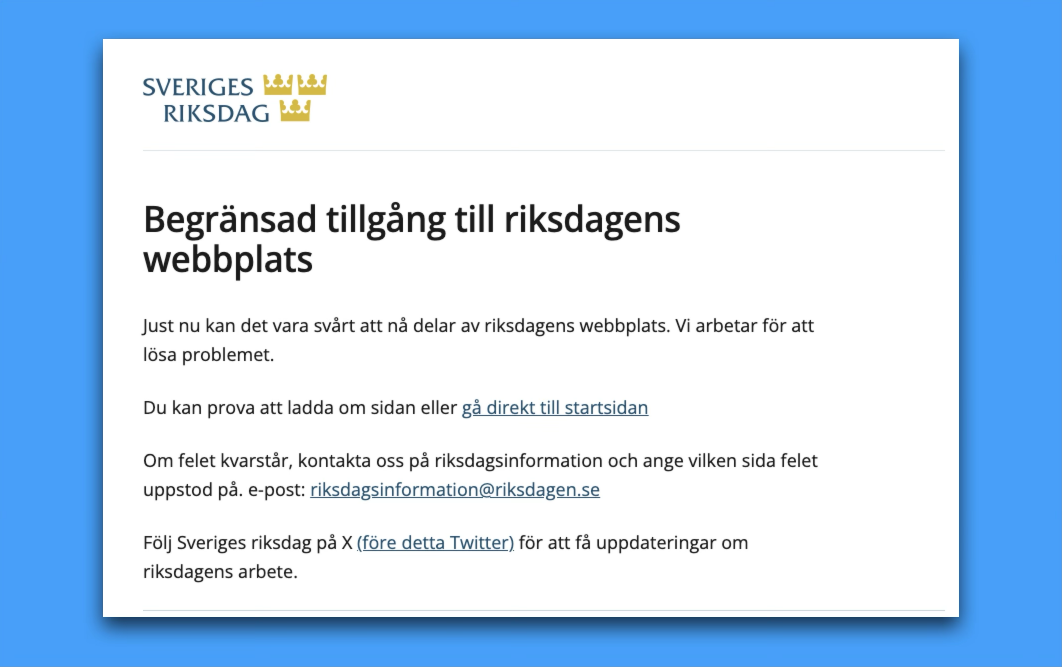 När det är svårt att nå riksdagens webbplats uppmanas besökare idag att följa riksdagens arbete via en proprietär amerikansk plattform som kräver konto för att läsa inlägg och som 15% av Sveriges befolkning använder (5% dagligen). Det är en plattform som uppmärksammats med anledning av hur lätt dess användare skapar 'AI'-genererade bilder på barnövergrepp och vars ägare regelbundet publicerar vit makt-främjande inlägg. The Guardians senaste granskning visar att Elon Musk gjorde X-inlägg i ämnet under 26 av 31 dagar i januari i år.